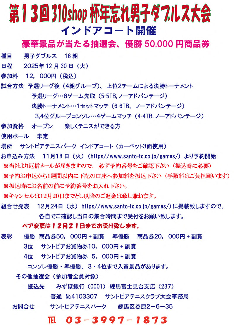 第13回310Shop杯男子ダブルス大会のご案内 (予約受付は11月18日より) 2025.11.07 男子ダブルス Tweet 前の記事 アドバンス女子ダブルス大会 各月の大会要項 *お申し込みはこちら 2020.12.01 次の記事 記事がありません