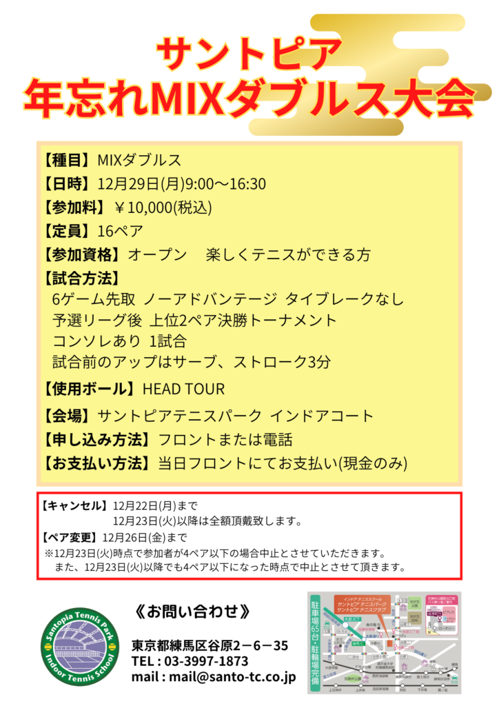 年忘れMIXダブルス大会開催 投稿者: santo-staff2025年11月30日2025年12月7日イベント、新着 12月29日(月)は 年忘れMIXダブルス大会を開催致します。 レベルはオープンとなり、楽しくテニスができる方大歓迎! 皆様のご参加をお待ちしております! 詳細は画像をご覧ください。