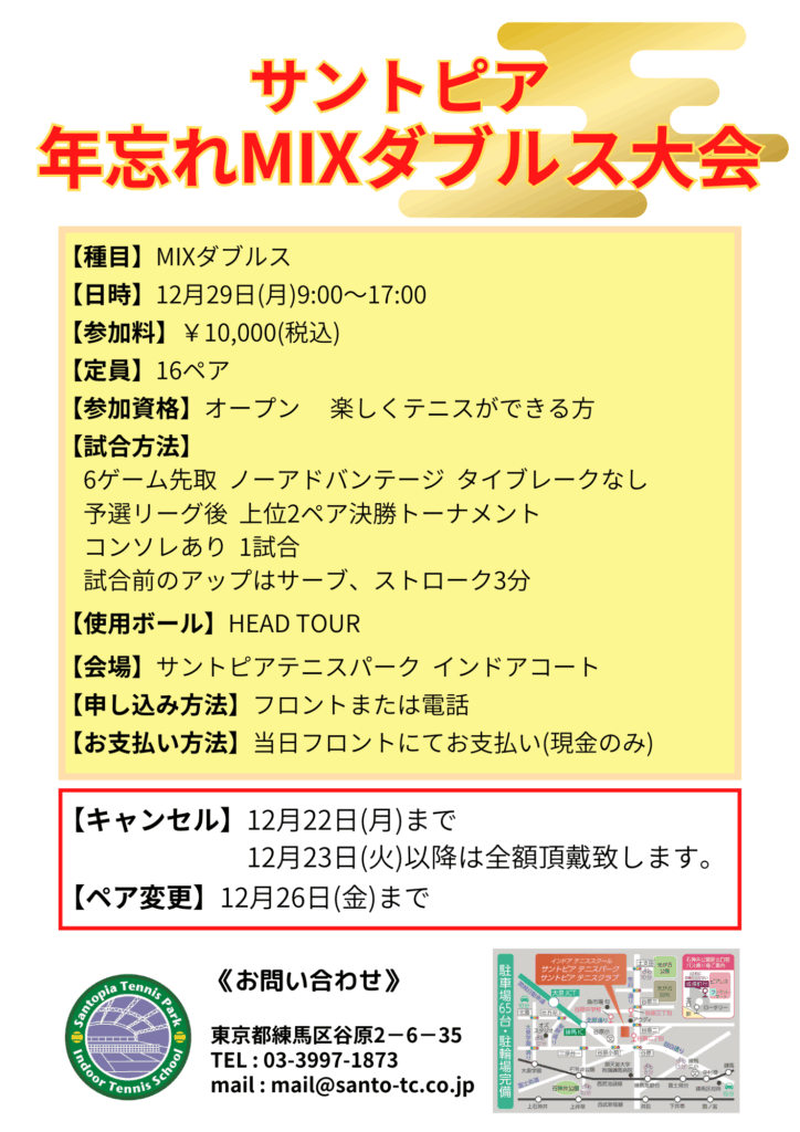 年忘れMIXダブルス大会開催 投稿者: santo-staff2025年11月30日イベント、新着 12月29日(月)は 年忘れMIXダブルス大会を開催致します。 レベルはオープンとなり、楽しくテニスができる方大歓迎! 皆様のご参加をお待ちしております! 詳細は画像をご覧ください。