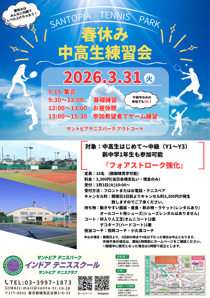 春休み中高生練習会のお知らせ 投稿者: santo-staff2026年2月15日イベント、スクールイベント、新着 2026年3月31日(火) 春休み中高生練習会を開催! 対象は、はじめて~中級の中高生! また、4月より新中学生の方も大歓迎です! サーフェイスは砂入り人工芝(オムニコート)2面とデコターフ(ハードコート)1面です。 シューズはオールコート用シューズをお持ちください。 お持ちでない方は、外用運動靴でもOK! 詳しくは画像をご覧ください。 皆様のご参加をお待ちしております!