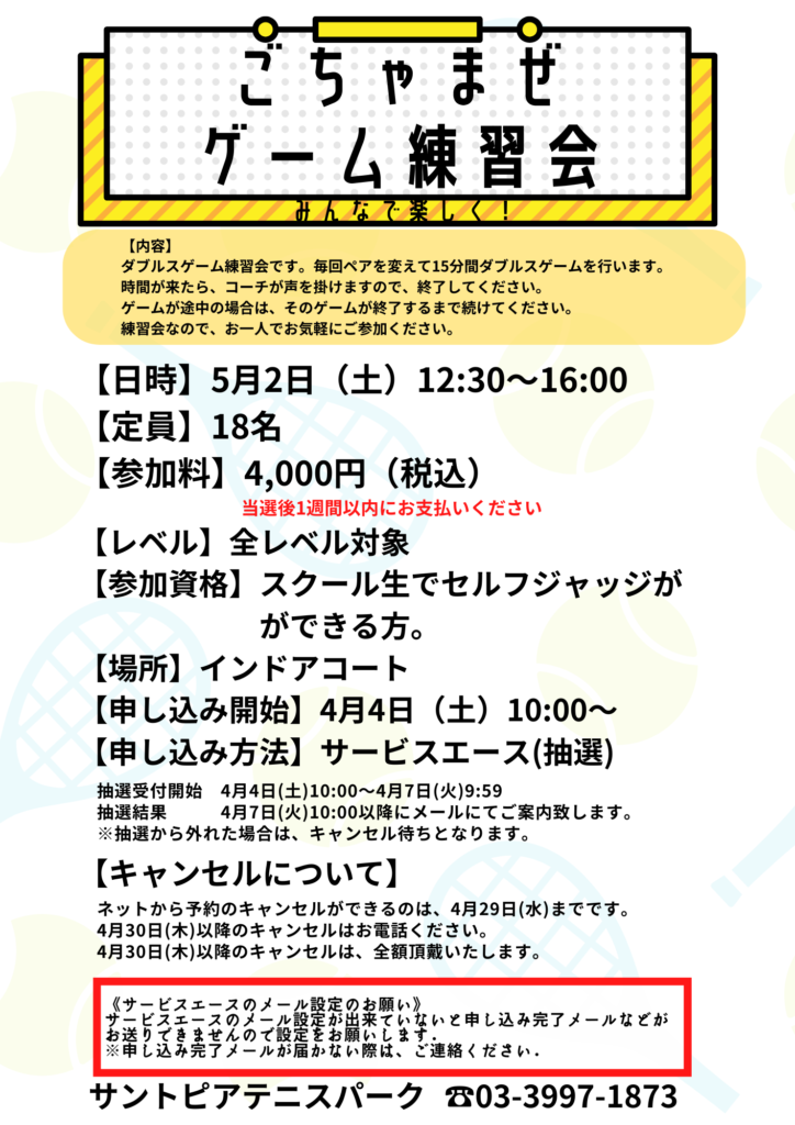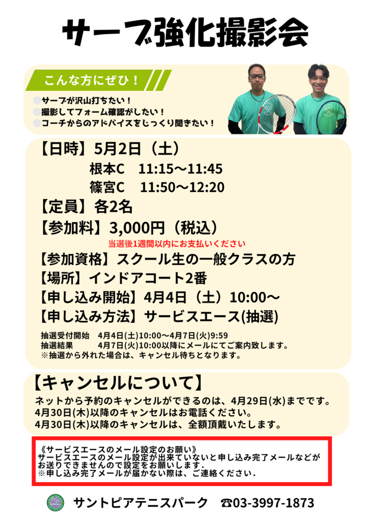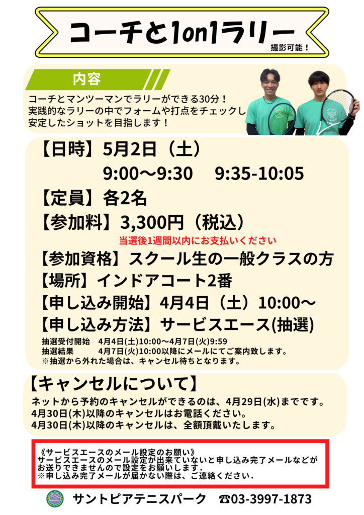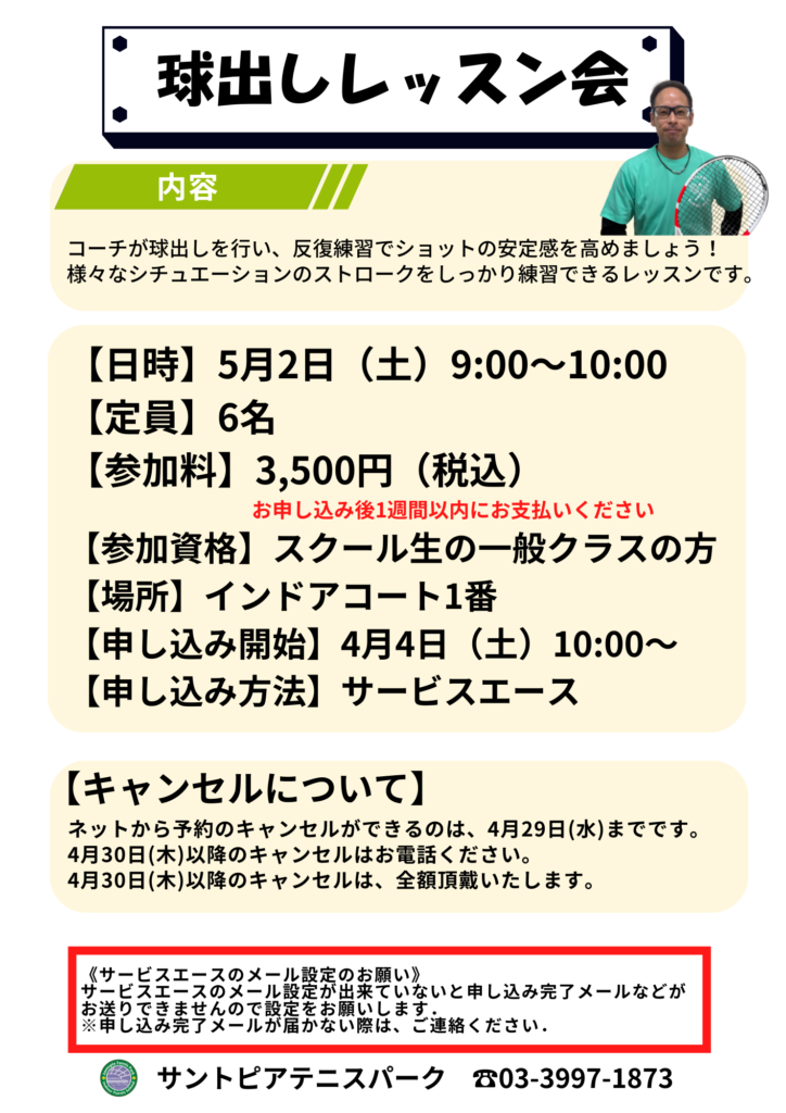 5/2(土)ゴールデンウィークイベントのお知らせ 投稿者: santo-staff2026年3月18日English DE Tennis 5月2日(土)はゴールデンウィークイベントを開催! ・球出しレッスン会 ・コーチと1on1ラリー ・親子テニス ・サーブ強化撮影会 ・ごちゃまぜゲーム練習会 受付開始は4月4日(土)10:00~ 皆様のご参加をお待ちしております!