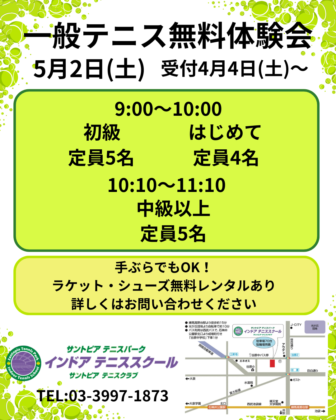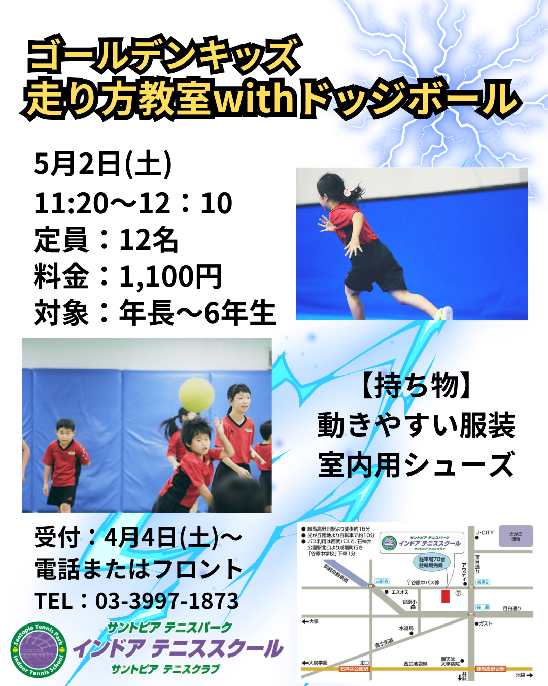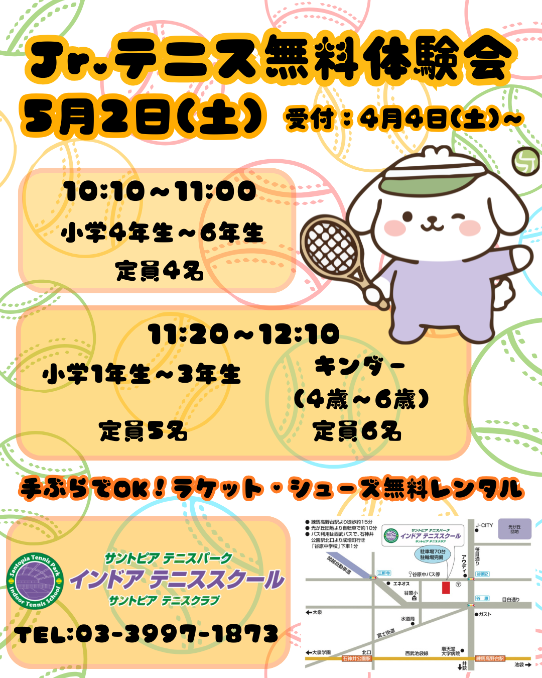 5/2(土)ゴールデンウィーク体験イベントのお知らせ 投稿者: santo-staff2026年3月21日2026年3月18日ゴールデンキッズ、スクールイベント、入会/体験イベント、新着 5月2日(土)はゴールデンウィークイベント開催!! ・テニス一般体験 ・テニスジュニア体験 ・ゴールデンキッズ走り方教室withドッジボール 詳細は画像でご確認ください。 皆様のご参加お待ちしております!